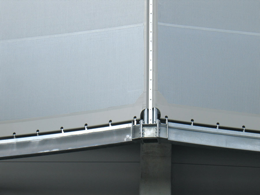 Das Gewebe wurde nach dem Einheben von der Gebäudedachkante aus sukzessive von oben nach unten in die Kederleisten eingezogen, gespannt und geklemmt.